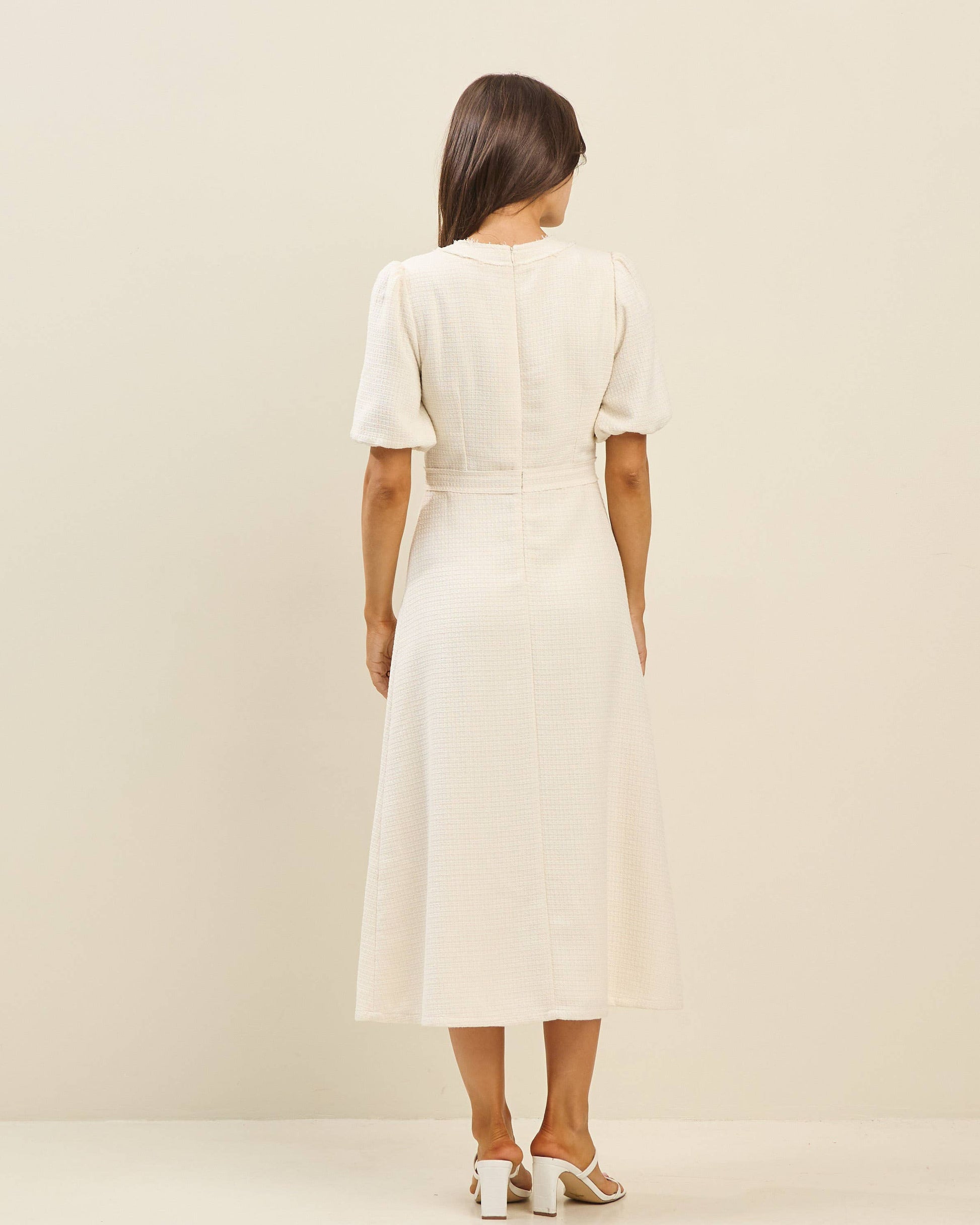 Embrace timeless charm with the Jackie Midi Dress, designed to effortlessly blend classic elegance and playful details. This feminine favorite features a charming decorative button front that adds a touch of vintage allure, while the back zipper ensures a smooth fit. Puffy sleeves with elastic bands bring a flirty bounce to your look, perfectly balanced by a fitted waist that flatters your silhouette. The A-line cut flows gracefully, making it ideal for day-to-night occasions. Whether you're headed to brunch or a garden party, this dress adds a dash of whimsy to your wardrobe with every wear.