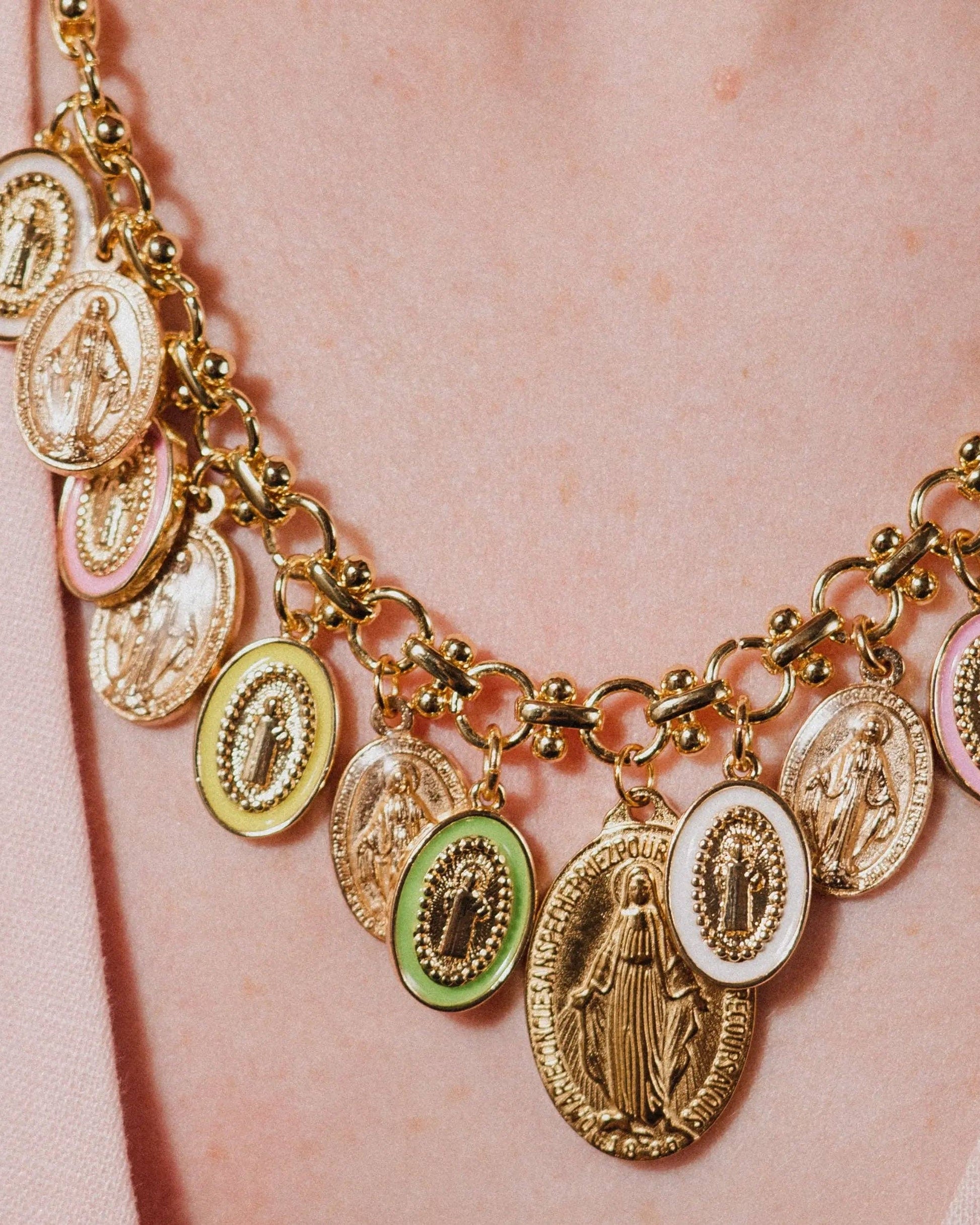 Celebrate faith with a touch of sparkle! The Caitlyn Necklace is a charming gold piece decked out with delicate Virgin Mary charms that blend devotion and style effortlessly. Each charm captures her calm and sacred aura, making this necklace both a meaningful keepsake and a chic accessory. Crafted from high-quality gold, it shines with lasting brilliance, perfect for adding a heavenly glow to any look—whether you're at a special mass or a night out. Faith has never looked so fabulous!