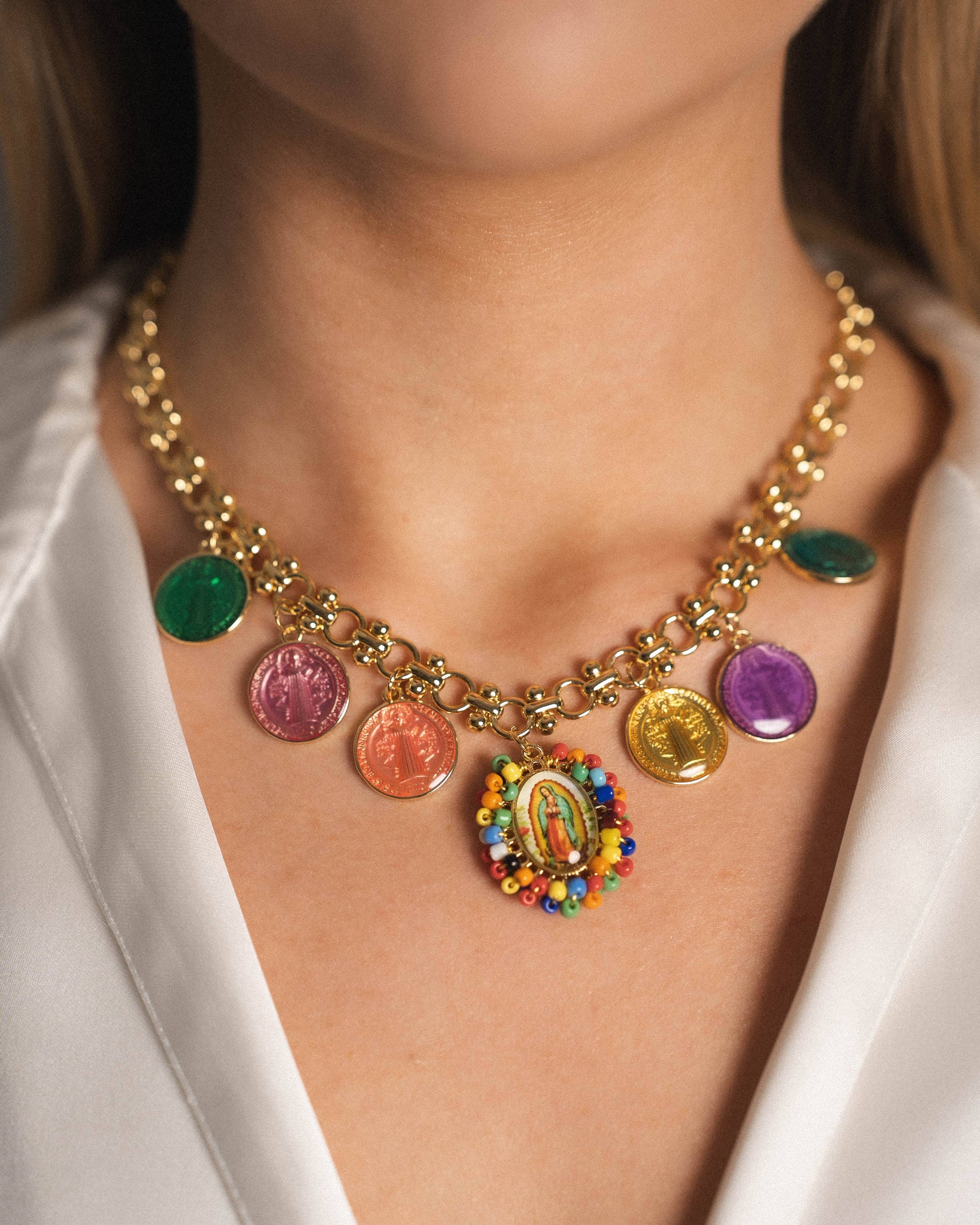 This hand-painted, gold-plated necklace features a charming link chain adorned with colorful enameled Virgin of Guadalupe medals that spark joy and devotion. The centerpiece pendant, surrounded by multicolored beads, proudly displays the sacred image of the Virgin—a beautiful symbol of faith, protection, and guidance. Perfect for anyone wanting a fun yet meaningful spiritual accessory, this necklace blends character with elegance. ✔️ Gold-plated for lasting shine ✔️ Brightly enameled Saint Benedict medals ✔️ Faith-inspired, traditional design ✔️ Crafted in Spain with top-quality materials Keep the protective spirit of the Virgin and Saint Benedict close with this playful amulet of devotion.