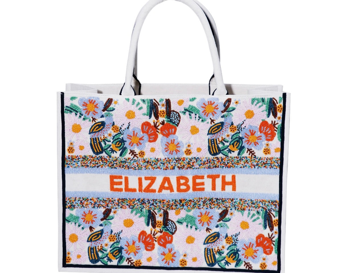 - In your notes upon check out put down exactly what you want to have the tote read please and the image you are choosing, bamboo handles or regular handles. The colors of the beading for name varies and is chosen by the company.