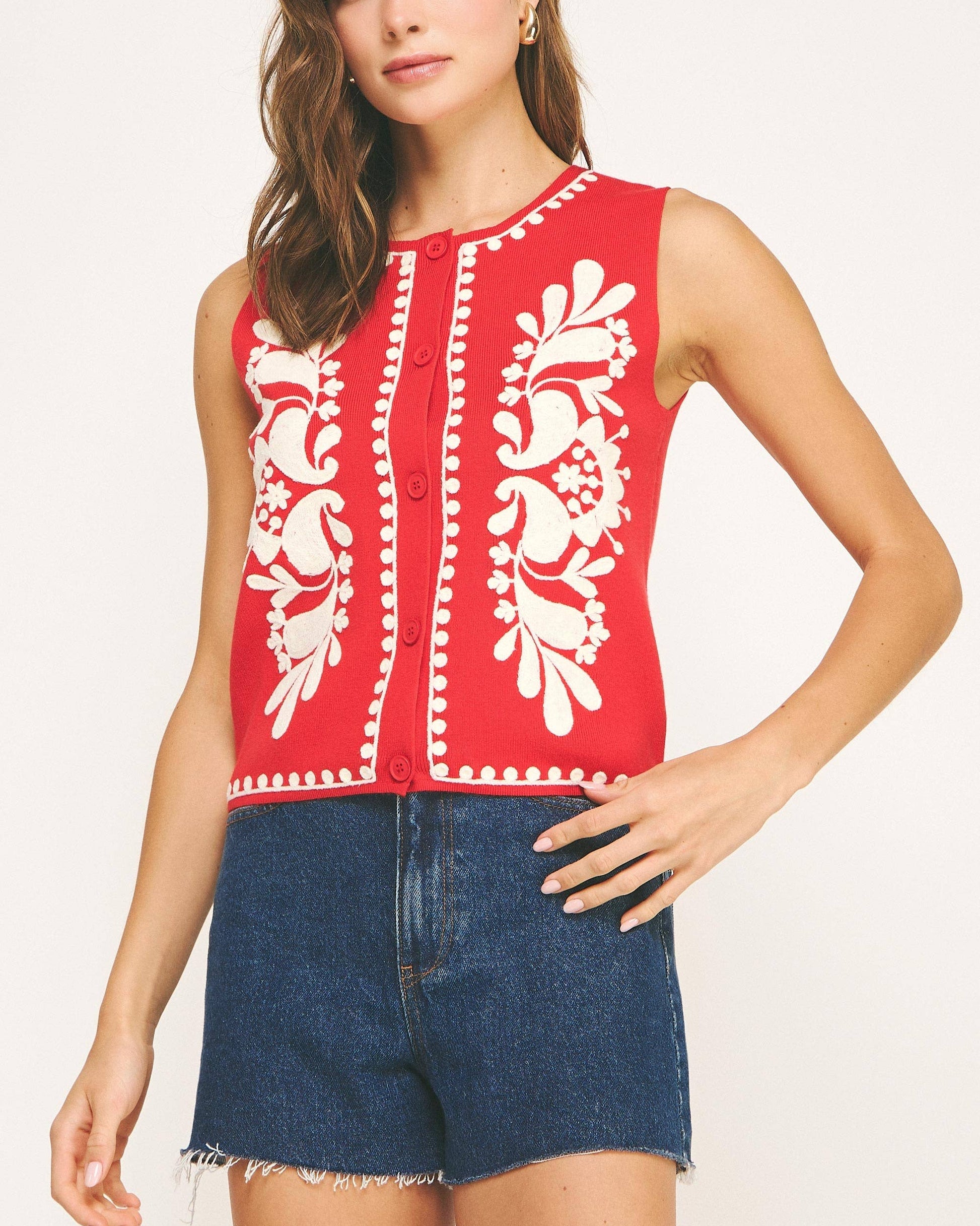 The Heidi Vest is your new go-to for effortless style with a playful twist. Crafted from soft knit fabric, this sleeveless vest delights with intricate floral embroidery across the front, adding a splash of whimsy to any outfit. Featuring a button-down closure and a round neckline, it’s perfect worn solo as a top or layered over a long-sleeved tee for extra flair. Whether paired under a blazer, a denim jacket, or a barn jacket, the Heidi Vest brings a charming, versatile vibe to your wardrobe that’s both fun and functional.