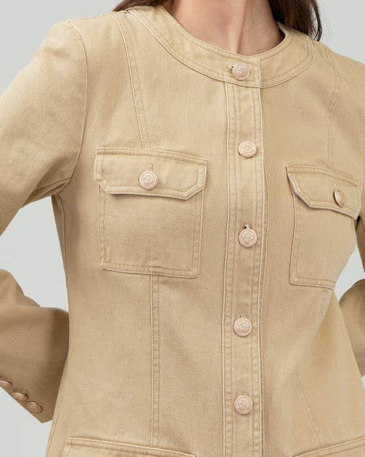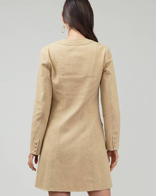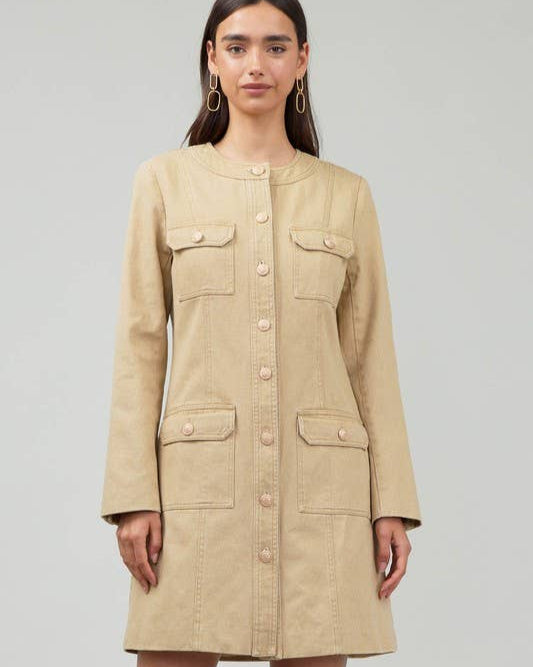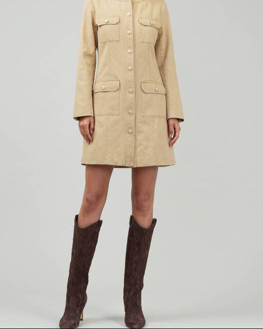 The Monique Dress is a playful twist on a classic silhouette, crafted from structured denim for a polished yet fun look. Featuring a front decorative gold button closure and charming pockets, this dress blends tradition with eye-catching details. Its long sleeves and round neck offer timeless appeal, while the versatility lets you wear it as a dress or effortlessly as a lightweight coat. Perfect for adding a dash of retro flair to any outfit, the Monique Dress keeps your style both classic and creatively bold.
