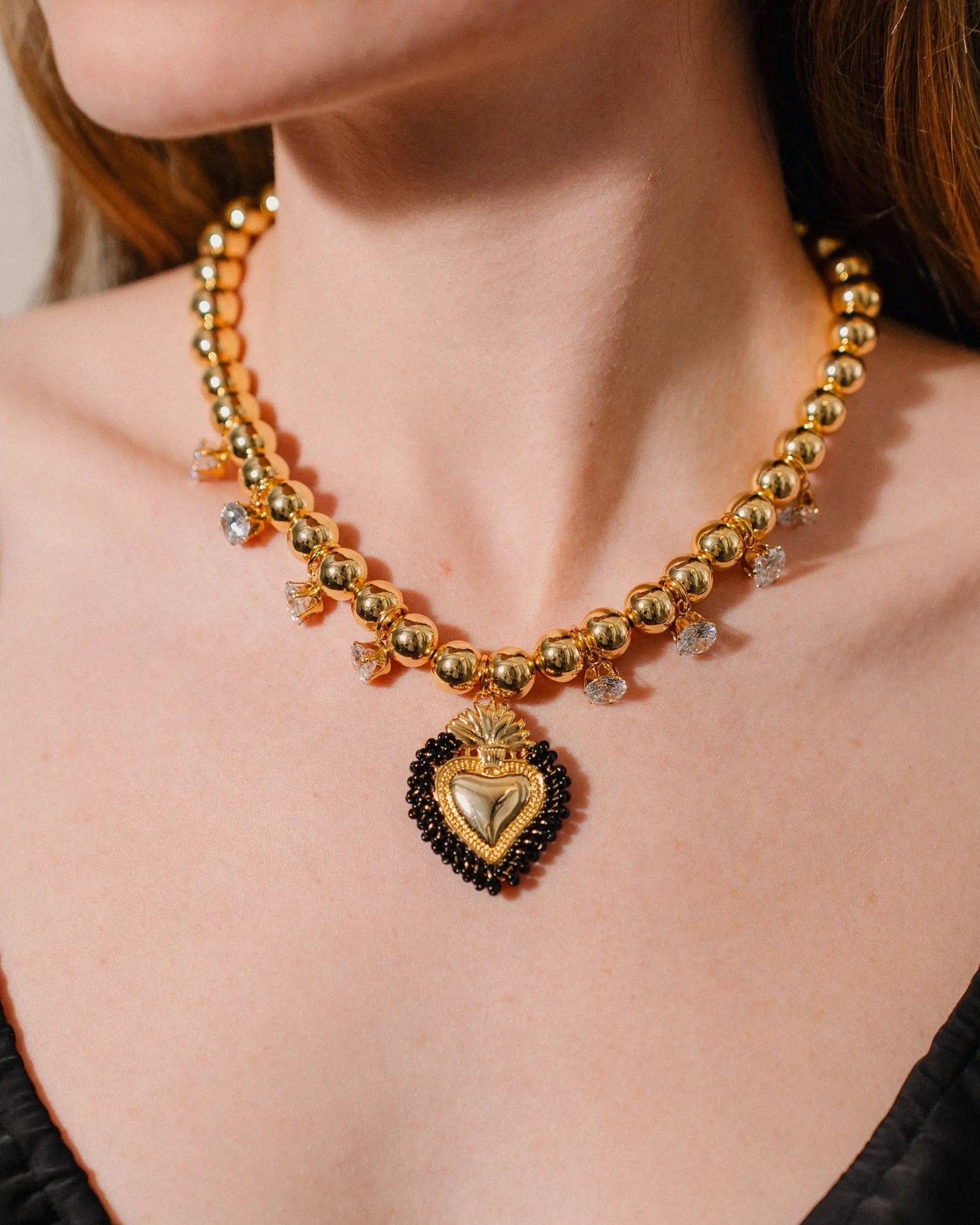 Discover the Amora Necklace, where playful charm meets spiritual sparkle. This gold bead necklace dazzles with a shimmering ball chain, spotlighting a radiant Sacred Heart ex-voto pendant at its center. Encircled by striking black beads, the pendant pops with contrast, while twinkling cubic zirconia along the chain add a touch of divine magic. Perfect for those who love a little sparkle wrapped in meaningful symbolism.