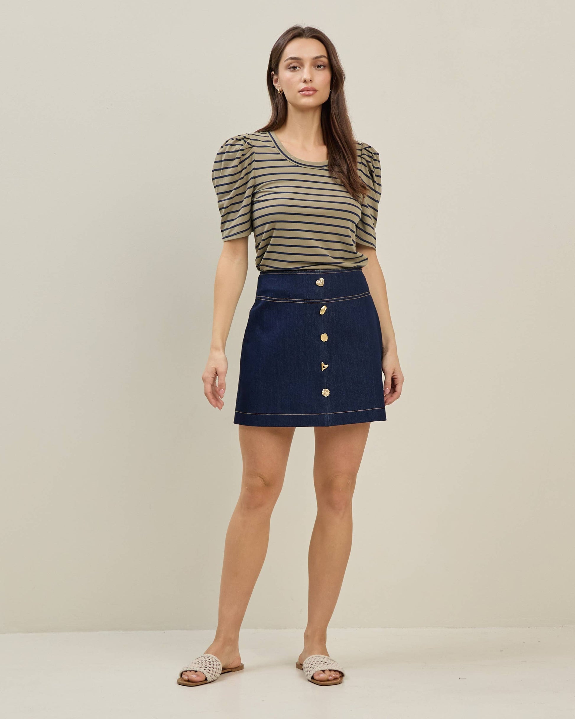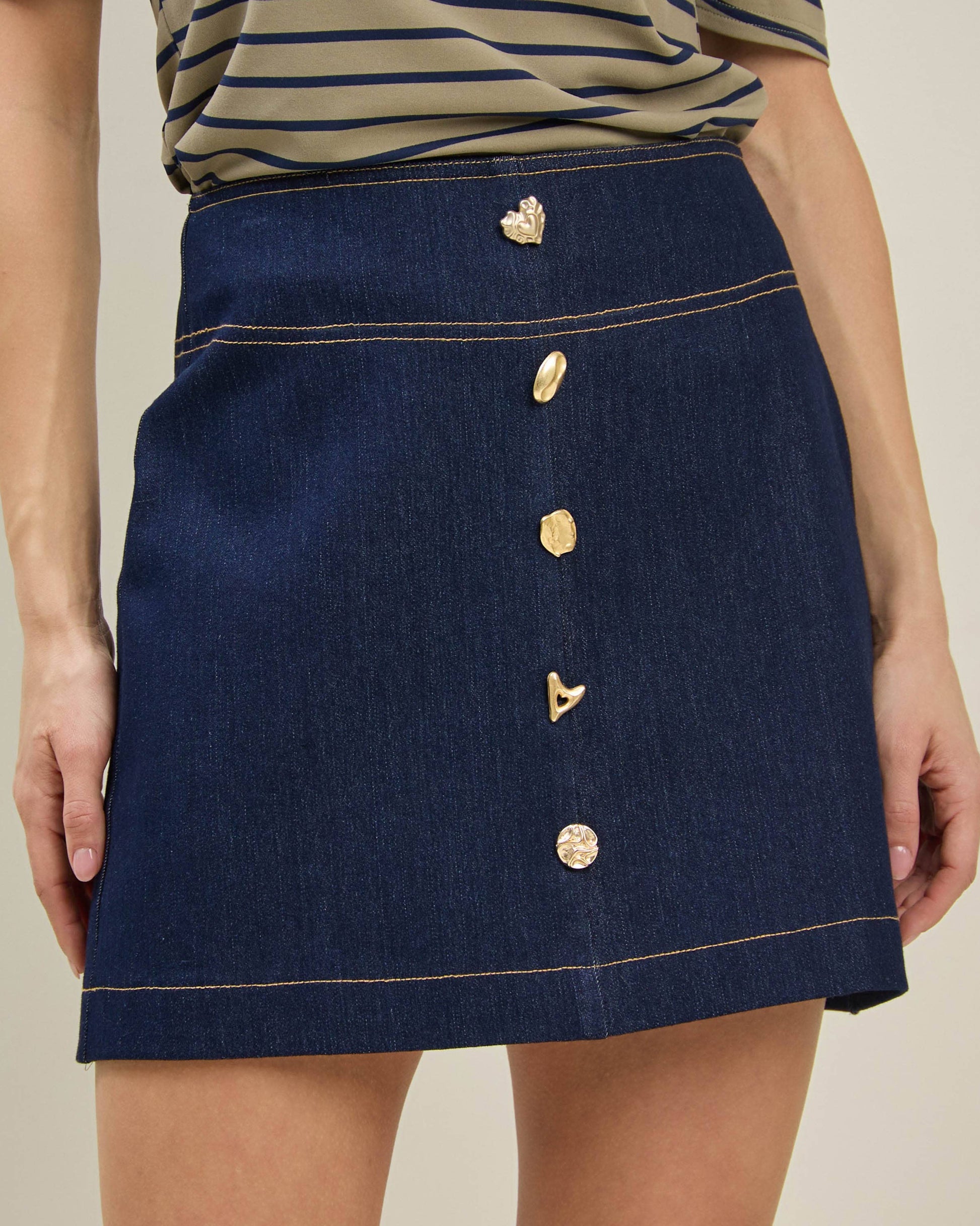 The Kit Jewel Skirt is a super stretchy mini skirt designed in a flattering A-line silhouette that adds a fun, flirty vibe to any outfit. Its playful button-front detail brings a charming touch, while the zipper back closure ensures a perfect fit. This versatile piece is on trend and effortlessly pairs with everything from casual tees to dressy tops, making it a must-have for your wardrobe. Whether you're dressing up for a night out or keeping it casual, this skirt’s comfort and style will keep you feeling confident and playful all day long.