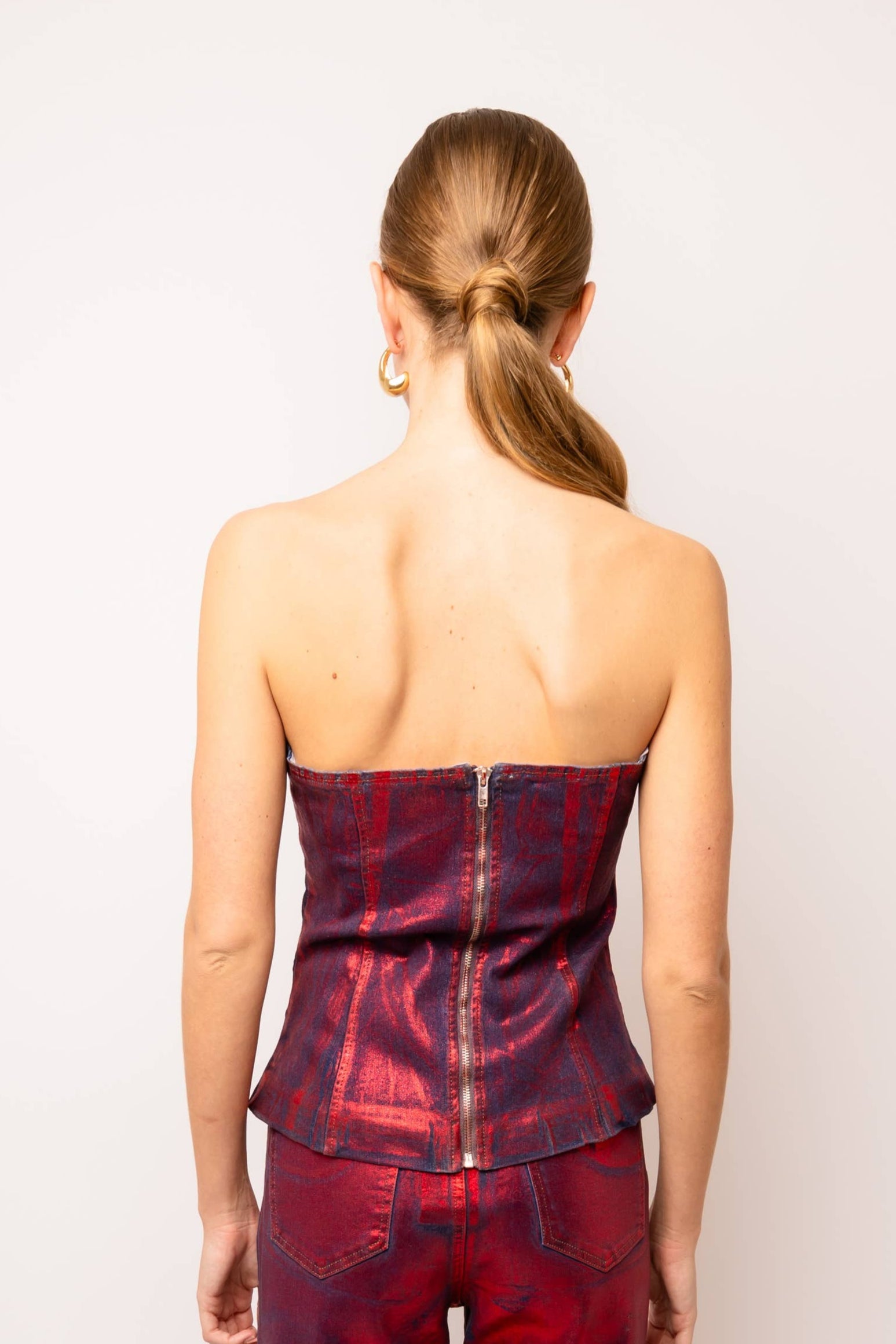 The Johanna Top is a fitted bandeau designed to turn heads with its sleek rear zip and iconic denim stitching. Crafted from a super luxe stretch foil-coated denim fabric, it offers both comfort and a hint of shimmer for a standout look. Whether paired with matching denim or mixed with your favorite pieces, this versatile top effortlessly transitions from casual days to chic nights. Play up your style by pairing it with the Johanna Pant for a coordinated, fashion-forward outfit that's as fun as it is fabulous. A must-have twist for your wardrobe!.