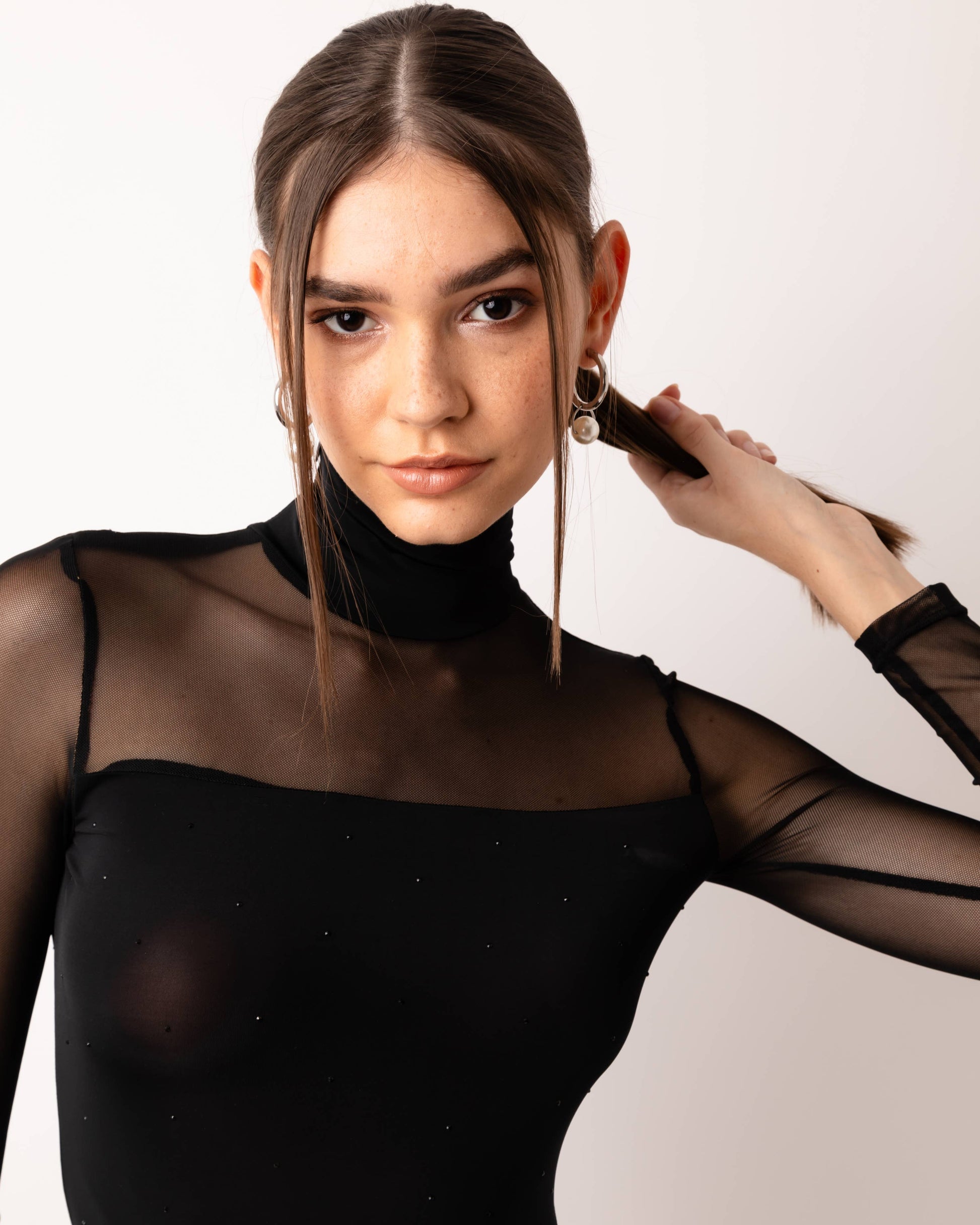The Luna Dress is a playful twist on the classic mini, featuring a high neckline and stretchy fabric that hugs your silhouette comfortably. A sheer mesh panel adds a hint of allure, while scattered gunmetal crystals catch the light with every move. The unique sleeve detail brings an unexpected edge, making this dress perfect for nights when you want to shine and stand out. Effortlessly chic and fun, the Luna Dress is designed to keep you feeling confident and ready to turn heads wherever you go.