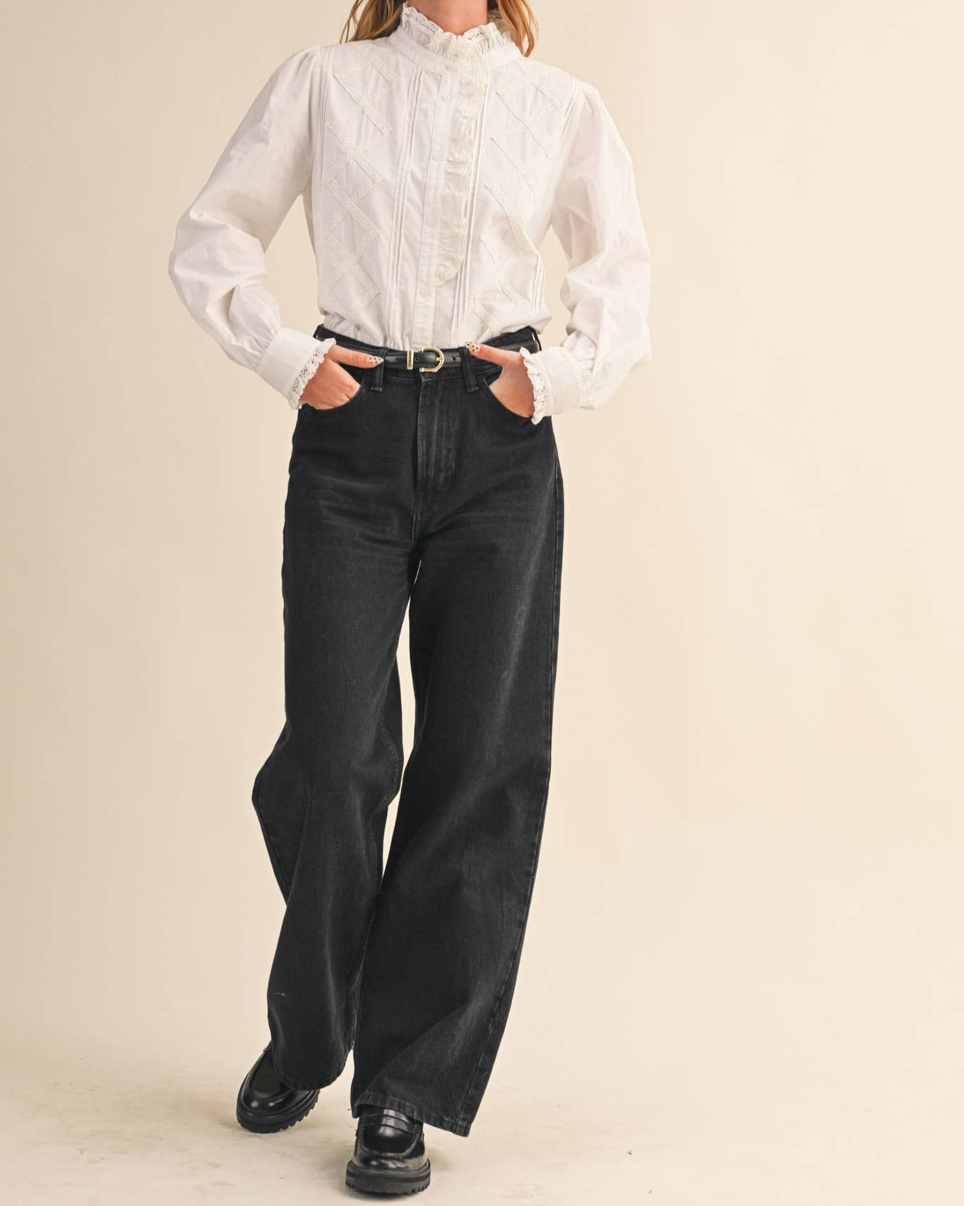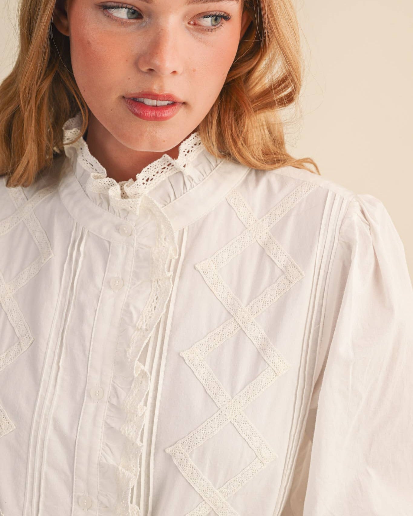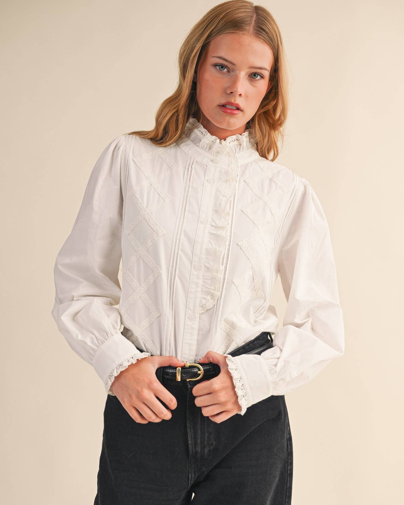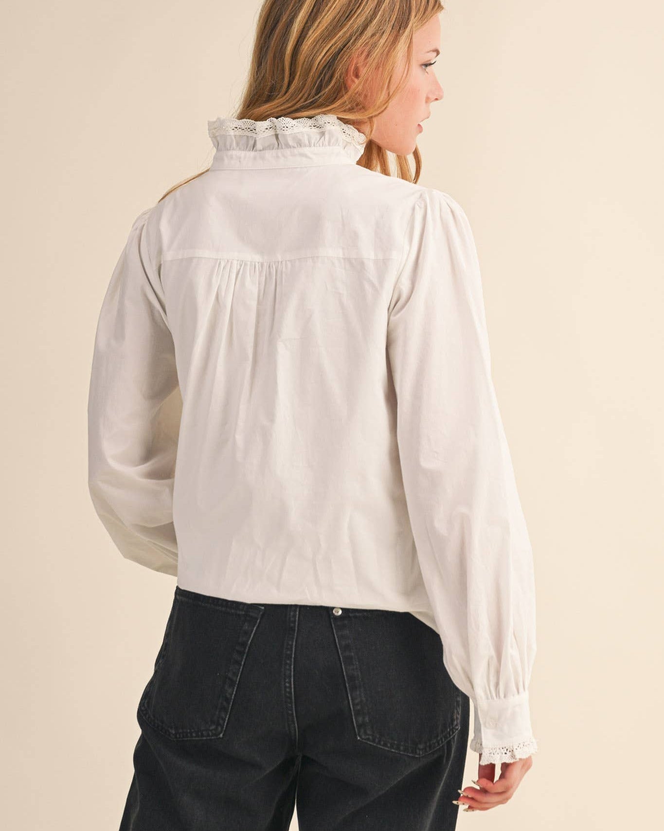 Fall in love with the Lana Top’s charming vintage flair! This playful piece features a delicate ruffled lace trim that decorates the high neckline and cascades down the button placket, adding a touch of romantic whimsy. The relaxed bodice is complemented by long puff sleeves finished with buttoned cuffs framed in ruffled lace, creating a soft, feminine silhouette. Beautiful lace trim paired with subtle pin tuck detailing on the front bodice enhances its nostalgic vibe. Fully lined for comfort, this top pairs effortlessly with jeans or skirts, making it perfect for days when you want to feel perfectly pulled together with a dash of classic elegance.